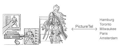 Split Body: Voltage-In / Voltage -OutA system has been developed for the actuation of a body. A Touch-Screen interface to a multiple musclestimulator allows the body´s movements to be programmed by touching the muscle-sites on the computer model. Orange flesh maps the possible sites, red flesh indicates the actuated muscle(s). The sequence of motions can be replayed continously with it´s loop function. As well as choreography by pressing, it is possible to paste sequences together from a libary of gesture icons. The improvise funktion allows random motions to be superimposed. The system allows simulation of the programmed movement for analysis and evaluation before transmisson to actute the body. At a lower stimulation level, it is a body prompting system, at a higher simulation level it becomes a body actuation system. With the third hand attached, the STIMBOD software results in a SPLIT BODY: with voltage in on the LHS choreographing limb movements and voltage out on the RHS controlling the Third Hand. STIMBOD also becomes the seductive interface for the REMOTE actuation of a body - the means by which a motion is displayed and repositioned from one body to another body in another place. Electronically CONNECTED and COUPLED BODIES can extrude agency, with a body´s awareness neither being "all-here" nor "all-there".
