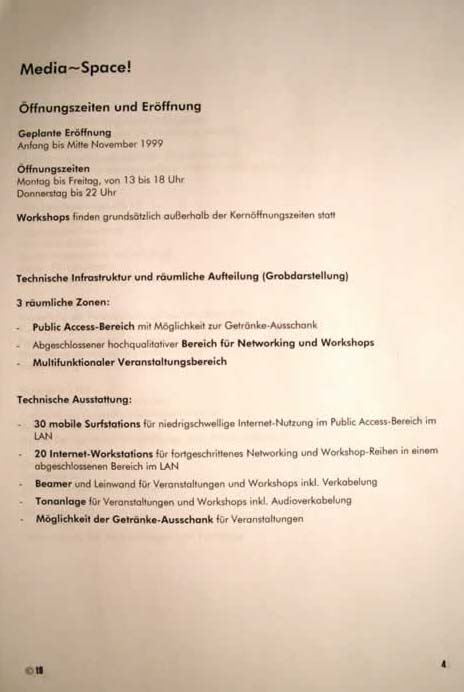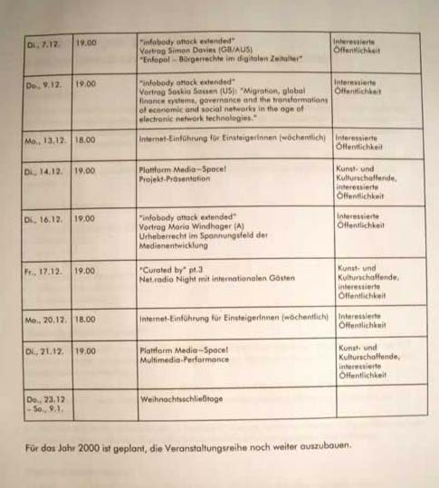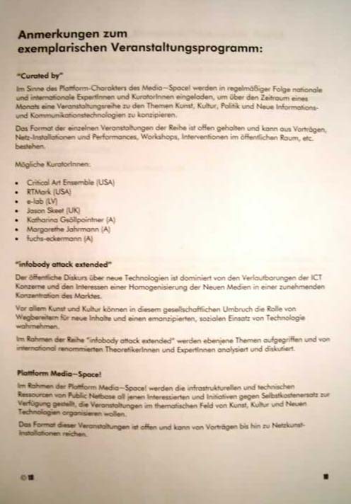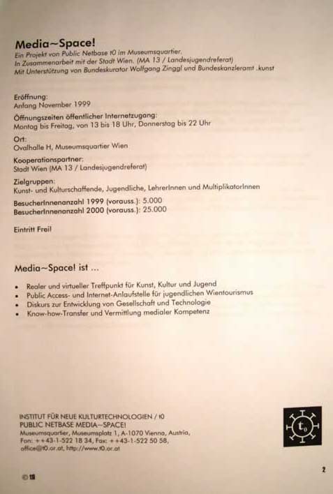 On 5 April, 2000, Public Netbase was dismissed from its facilities at the Museumsquartier under the pretext of imminent building works at the Fischer-von-Erlach section, the section housing its offices. The date set was 30 April 2001, and no replacement facilities or prospective date of re-entry were indicated. In spite of the “readiness for dialogue“ recurrently claimed by Wolfgang Waldner, General Manager of the Museumsquartier’s carrier company, there was an overwhelming impression that Public Netbase, by then a successful cultural institution, was supposed to be stripped off its vital assets. As an early indication, the planned enlargement of the Media~Space at the Museumsquartier’s Ovallhalle H was overridden by a different plan in 1999.