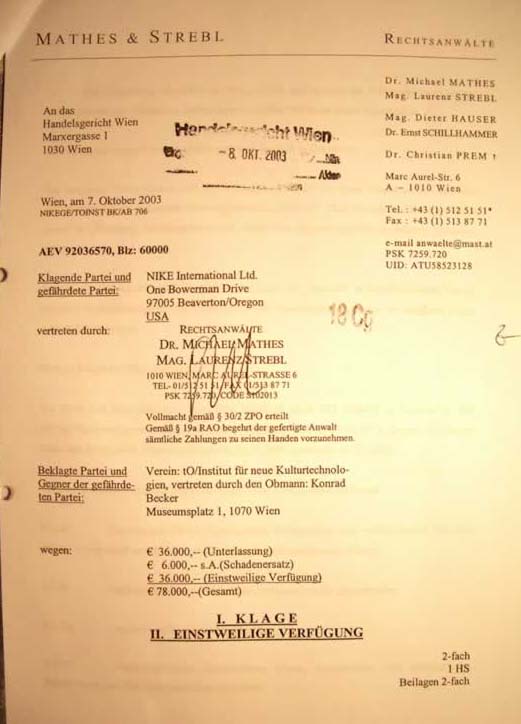 Leaving behind emotionalized tags such as “drug square” and “traffic nightmare”, Karlsplatz was supposed to become a “productive urban jungle”, rather than being trimmed and dressed by bourgeois security paranoia. A “Free Media Camp” set up by Public Netbase, Radio Orange 94.0, and PUBLIC VOICE Lap on 27 June, 2003 in cooperation with MALMOE magazine and cultural lobbying group IG Kultur Wien, left no doubt that there was no lack of concrete initiatives towards a cultural renovation of Karlsplatz. The Media Camp, whose presence at Karlsplatz throughout the summer carried a strong symbolic value, offered more than one hundred events dealing with the precarious survival of free media in Austrian cultural and media policies, and demanded strong foundations for a participatory public in a future network democracy. The latter is jeopardized not only by governments, but increasingly by private business interests, as a further step in the Karlsplatz campaign was going to show: together with the international artists group 0100101110101101.org, Public Netbase staged a fake re-naming of Karlsplatz to “Nikeplatz”, with the idea of highlighting the disappropriation of public space occurring at many places. However, the “hardly believable Nikeplatz trick” was not directed against Nike per se; it was meant to illustrate the symbolic dominance of global business in public space. In recent years, the boundaries between the public and private realms have been experiencing a shift, transforming open urban space into semi-public areas. This process of privatization, manifest at railway stations, city squares, and shopping centers, leads to the exclusion of large segments of the public, in particular of groups already at the margins. The fact that Nike, a sporting goods producer known for its underground marketing strategies, would threaten to litigate for 78,000 Euros of damages, only strengthened the artists’ determination to make the functioning of public space the object of their work.